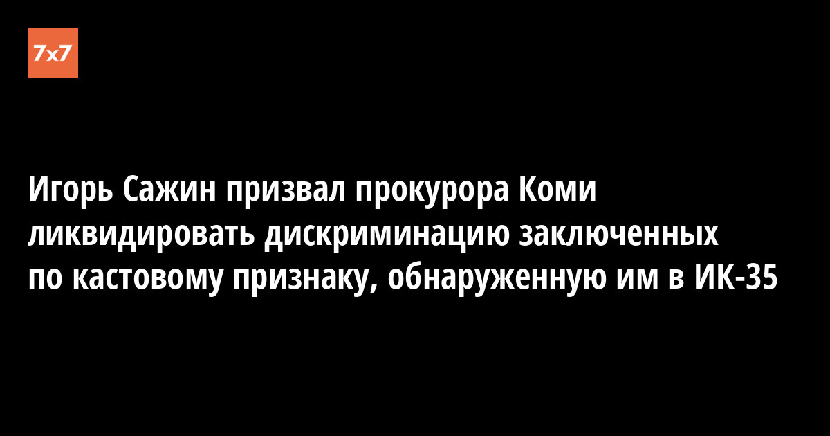Г-н Сажин вместе с еще двумя членами ОНК, Ириной Виноградовой и Николаем Дидюком, посетил ИК-35 в октябре с.г. В своем обращении к прокурору Коми, отмечая жилищную и бытовую неустроенность заключенных колонии, содержащихся в отряде строгих условий отбывания наказания (СУОН), которую, со ссылкой на Европейскую конвенцию по правам человека, Игорь Сажин называет бесчеловечной, правозащитник, кроме того, прямо указывает на имеющее место неформальное «кастовое» разделение спецконтингента, также нарушающее статью 14 конвенции, запрещающую дискриминацию.