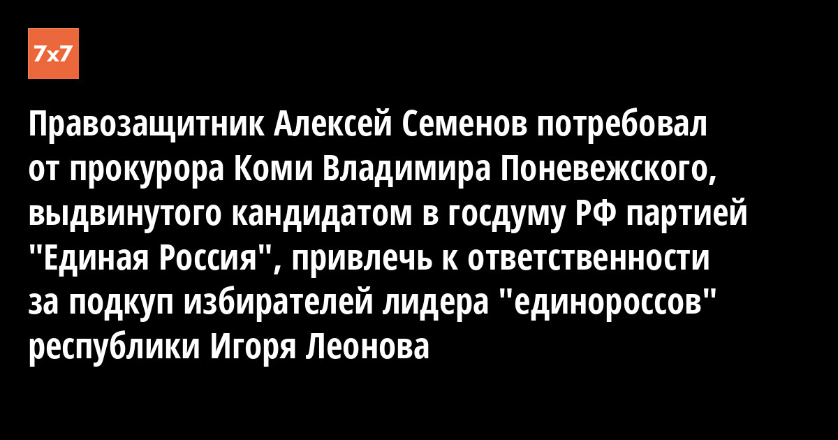 Член Коми правозащитной комиссии «Мемориал» Алексей Семенов сегодня вышел к прокуратуре Коми с требованием привлечь к ответственности кандидата в депутаты госдумы РФ, вице-спикера госсовета РК, лидера «единороссов» республики Игоря Леонова «за систематический подкуп избирателей и использование своего служебного положения в агитационный период избирательной кампании».