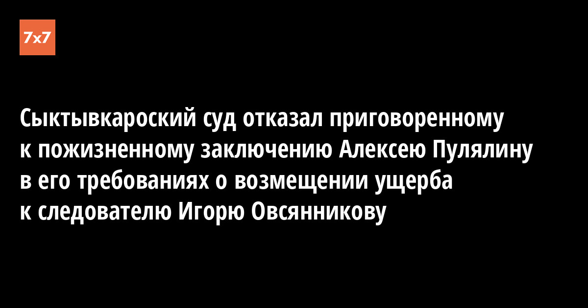 Сегодня, 16 ноября, судья Сыктывкарского суда Елена Нагибина отказала в иске Алексею Пулялину, осужденному к пожизненному заключению за поджог торгового центра «Пассаж», требовавшему обязать Следственное управление Следственного комитета (СУСК) РФ по Коми возместить ему материальный и моральный ущерб, причиненный действиями следователя СУСК Игоря Овсянникова.