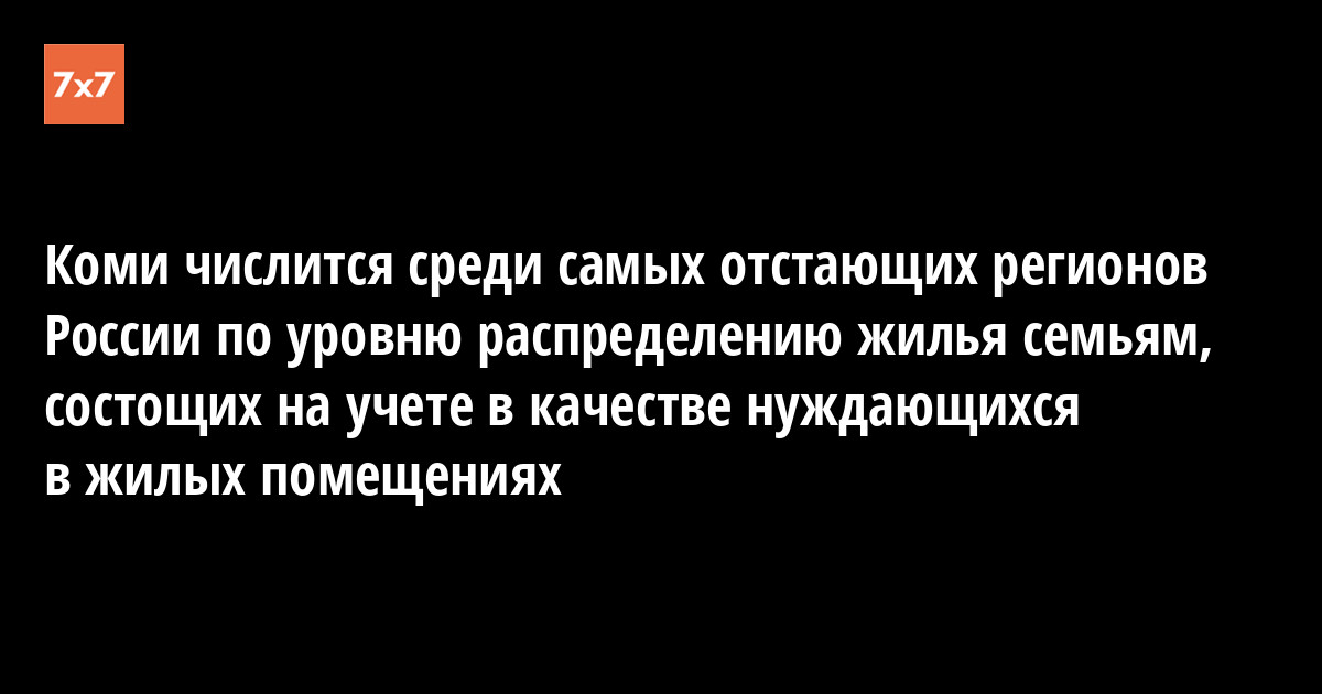 Кроме того, Коми числится среди отстающих по такому показателю, как соотношение числа семей, состоящих на учете в качестве нуждающихся в жилых помещениях на начало 2010, и получивших их в прошлом году. В среднем по России этот показатель равняется 8,6%, в Коми — 6,3%.