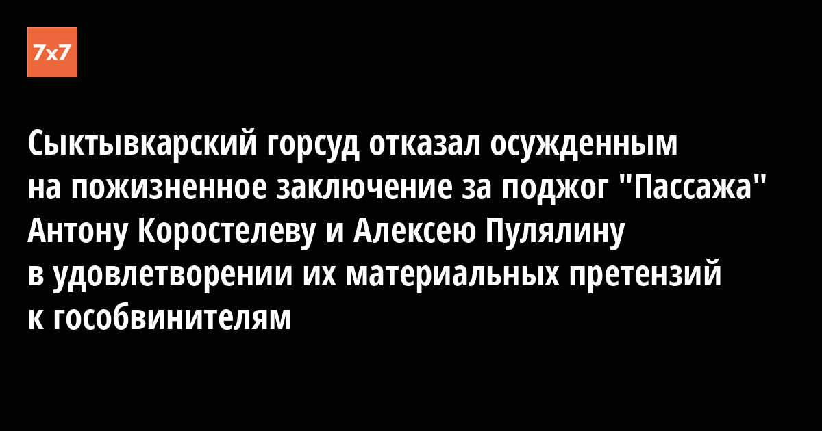 Сегодня Сыктывкарский городской суд оставил без удовлетворения жалобы осужденных на пожизненное заключение за поджог ухтинского торгового центра «Пассаж» Антона Коростелева и Алексея Пулялина, требовавших признать незаконными распространение сведений об их частной жизни и оскорбления со стороны Юрия Овчинникова и Антона Айназарова, которые в процессе по делу о поджоге «Пассажа» представляли гособвинение.