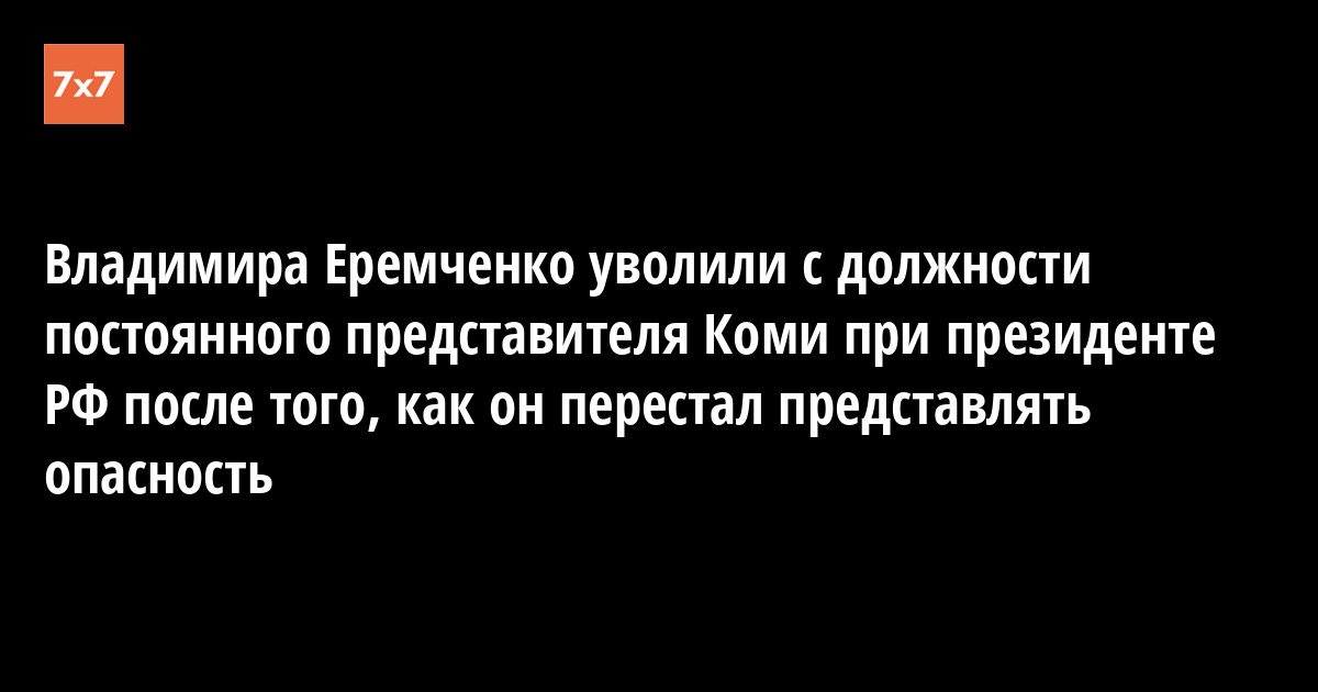 Сегодня, 30 марта, глава Коми Вячеслав Гайзер подписал распоряжение об освобождении Владимира Еремченко с должности постоянного представителя РК при президенте РФ. Источники «7x7» предполагают, что отставка связана с тем, что высокопоставленные чиновники Желтого дома в свете последних событий больше не боятся слива компромата со стороны экс-главы республиканского МВД.