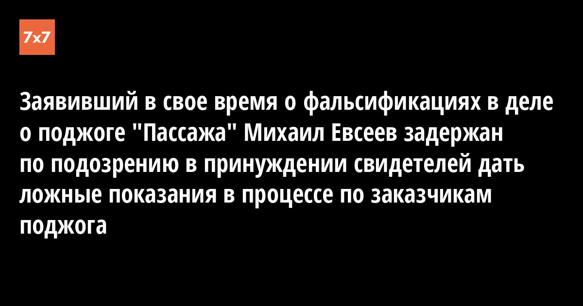 «Следственными органами Следственного комитета Российской Федерации по Республике Коми возбуждено уголовное дело в отношении бывшего оперуполномоченного МВД по РК Михаила Евсеева и иных неустановленных лиц, подозреваемых в совершении преступления, предусмотренного ч.4 ст.309 УК РФ (подкуп или принуждение к даче показаний или уклонению от дачи показаний, совершенные организованной группой). По данным следствия, в апреле т.г. Евсеев в составе организованной группы, совместно с иными неустановленными лицами осуществил действия, направленные на подкуп и принуждение к даче ложных показаний в судебном заседании по уголовному делу о предполагаемых заказчиках поджога ТЦ «Пассаж» двух свидетелей - сотрудников исправительной колонии №56 ГУФСИН России по Свердловской области, в которой отбывают пожизненное наказание поджигатели - Антон Коростелев и Алексей Пулялин.