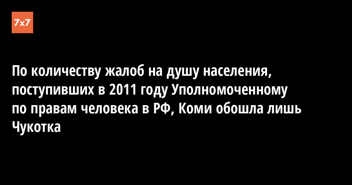 Как следует из ежегодного доклада главного омбудсмена России Владимира Лукина, с которым он выступил позавчера в Совете Федерации, Коми заняла второе место среди регионов России по количеству жалоб на нарушение прав и свобод человека в пересчете на душу населения, поступивших в 2011 году Уполномоченному по правам человека в РФ. Впереди нашей республики по этому показателю лишь Чукотка.
