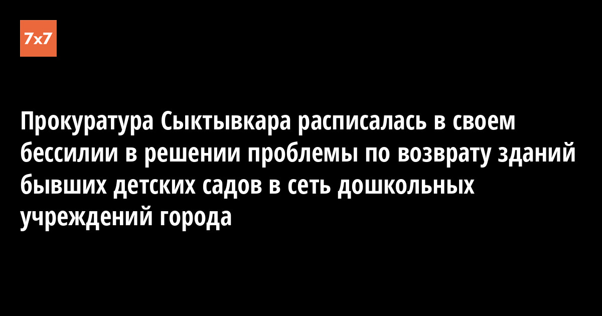 Как стало известно «7x7», руководитель Коми республиканской общественной организации родителей детей с особенностями развития (КРООР) «Особое детство» Юлия Посевкина получила недавно ответ из прокуратуры Сыктывкара на свое обращение с просьбой принять меры прокурорского реагирования, направленные на восстановление прав детей города на получение дошкольного образования, в частности, на возвращение в сеть дошкольных учреждений нескольких зданий детских садов, занимаемых ныне другими организациями. Суть ответа, подписанного зампрокурора города Александром Авроровым, свелась к тому, что «оспорить факт передачи зданий в настоящее время не представляется возможным».