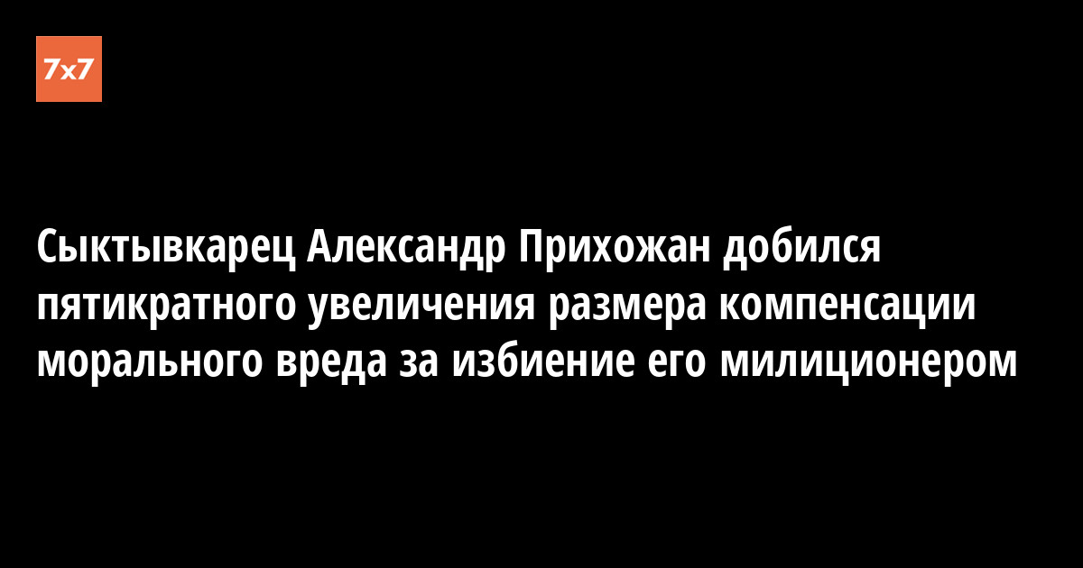 Как стало известно «7x7», сыктывкарец Александр Прихожан, около полутора лет назад избитый милиционером во время пребывания в спецприемнике, добился в Верховном суде Коми пятикратного увеличения размера компенсации за причиненный ему моральный ущерб, ранее оцененный Сыктывкарским горсудом в сумме 10 тыс. руб.