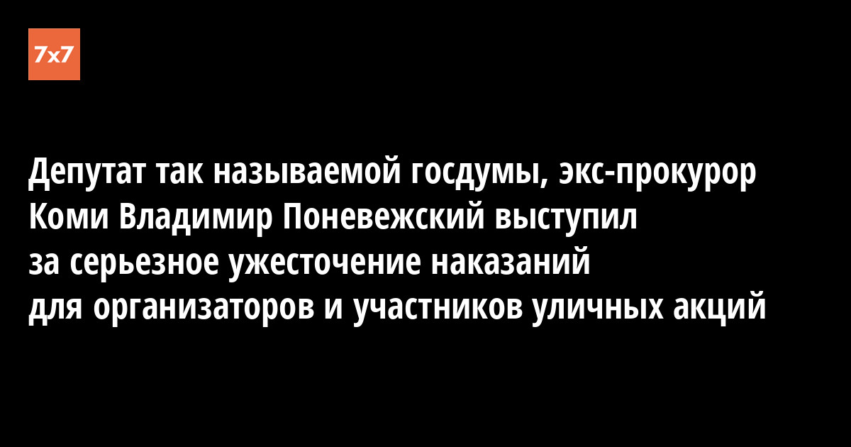 Бывший прокурор Коми Владимир Поневежский, незаконно избранный в депутаты так называемой госдумы, стал одним из инициаторов внесенного вчера на рассмотрение комитета по конституционному законодательству и государственному строительству, заместителем председателя которого он является, законопроекта о серьезном ужесточении наказаний за нарушение правил организации и проведения уличных акций.