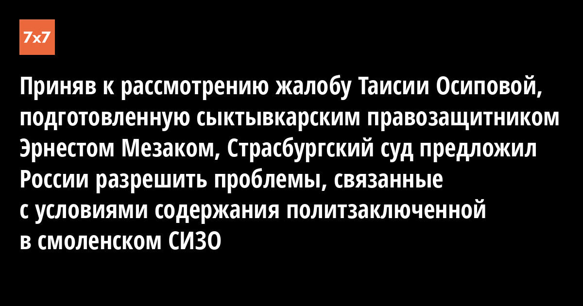 Как сообщил сегодня «7x7» член правления Коми правозащитной комиссии «Мемориал» Эрнест Мезак, являющийся также юристом Фонда содействия защите прав и свобод граждан «Общественный вердикт», Европейский суд по правам человека (ЕСПЧ) принял к рассмотрению подготовленную им жалобу политзаключенной Таисии Осиповой на бесчеловечные условия содержания в смоленском СИЗО, где она содержится как обвиняемая в покушении на незаконный сбыт наркотиков и приготовлении к сбыту наркотиков в особо крупном размере.