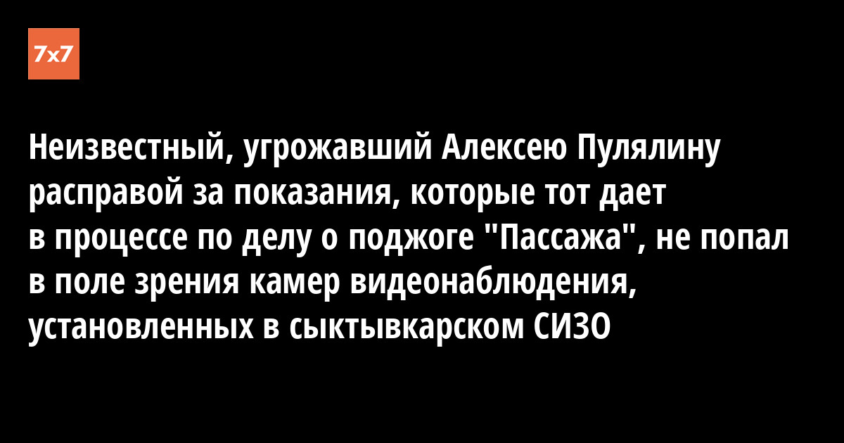 Напомним, 2 апреля содержащийся в сыктывкарском СИЗО-1 Алексей Пулялин, признанный виновным в поджоге «Пассажа» и являющийся потерпевшим по рассматриваемому делу, заявил в суде о том, что 30 марта перед выводом на прогулку его завели в кабинет оперативной и воспитательной работы следственного изолятора и вошедший туда неизвестный мужчина, представившийся Александром, пытался склонить его к даче ложных показаний по рассматриваемому уголовному делу. После отказа Пулялина, который заявил в процессе, что поджога не совершал, а подсудимых оговорил, не выдержав оказанного на него физического и психологического давления, «Александр» стал угрожать ему, сказав, что «ты здесь пробудешь недолго, а в колонии (Пулялин и Коростелев отбывают пожизненное наказание в ИК-56, расположенной в Свердовской области – «7х7») долго не протянешь». По просьбе Пулялина заявление о совершении в отношении него противоправных действий было направлено судом в Следственное управление Следственного комитета (СУСК) РФ по Коми.