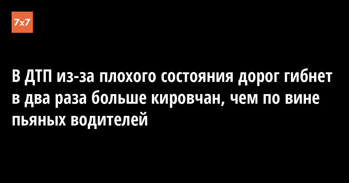 Вообще дорожно-транспортные происшествия, случившиеся по вине водителей, находящихся в состоянии алкогольного опьянения, у нас в последнее время (видимо, в связи с кампанией по борьбе с пьянством) называют едва ли не главной причиной гибели людей на дорогах, хотя, скажем, в ДТП из-за неудовлетворительного состояния дорог и улиц их гибнет не в пример больше. Так, по статистике МВД РФ, в «пьяных» ДТП за 8 месяцев 2012 года в Кировской области погибли 23 и ранены 124 человека – соответственно в 1,9 раза и в 2,7 раза меньше, чем в ДТП из-за неудовлетворительного состояния дорог и улиц, в результате которых погибли 44 и получили ранения 333 человека. При этом на долю дорожно-транспортных происшествий, причиной которых стало плохое состояние дорожной сети, приходится 20,3% общего числа ДТП, то есть практически каждое пятое, в то время как на долю «пьяных» ДТП – лишь 7,1%, то есть каждое четырнадцатое. И, если по числу «пьяных» ДТП в Кировской области наблюдается заметное (-8,9%) снижение в сравнении с январём-августом 2011 года, то по части ДТП из-за плохих дорог, наоборот, зарегистрирован резкий (+34%) рост. Тем не менее, руководители правоохранительных органов, равно как и региональных органов власти упрямо называют главной угрозой для безопасности дорожного движения именно пьянство, а не плохое состояние дорог.