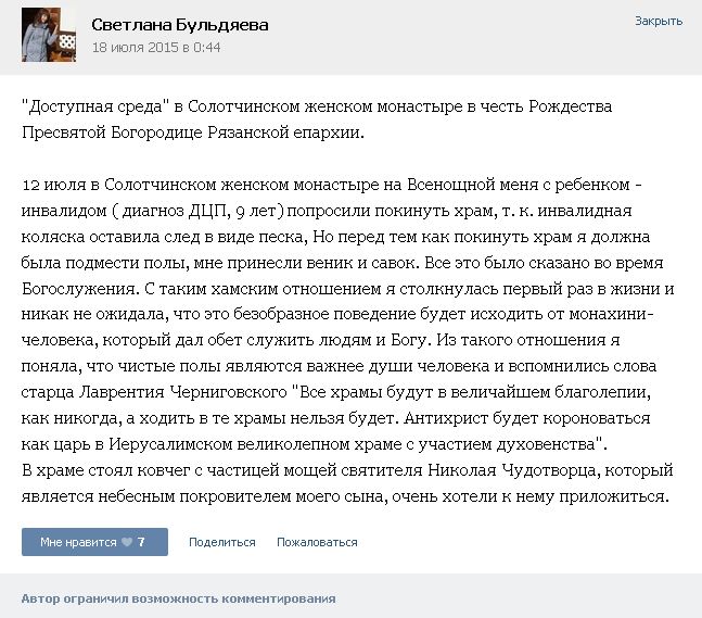 Рязанка Светлана Бульдяева на своей странице в социальной сети 18 июля рассказала, что ее с ребенком-инвалидом выгнали со службы в Солотчинском женском монастыре. Причиной, по ее словам, стала инвалидная коляска ребенка, которая оставила песочный след на полу. Перед тем, как уйти, Светлану попросили убрать песок и принесли веник и совок.