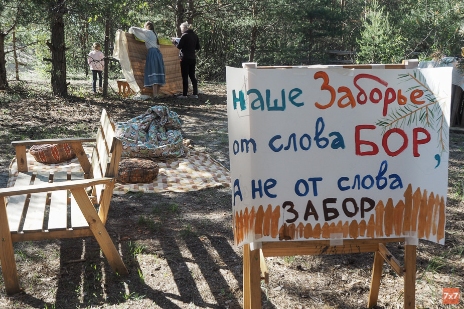 Жители села Заборье 18 мая пронумеровали деревья в небольшом лесу на берегу реки Старицы, провели мозговой штурм и показали детскую сказку, в которой волк из-за желания единолично владеть чудесным деревом погубил его. Таким образом они вышли «на самый мирный протест» против продажи частнику и дальнейшей возможной вырубки леса. Корреспондент «7x7» побывал на встрече.