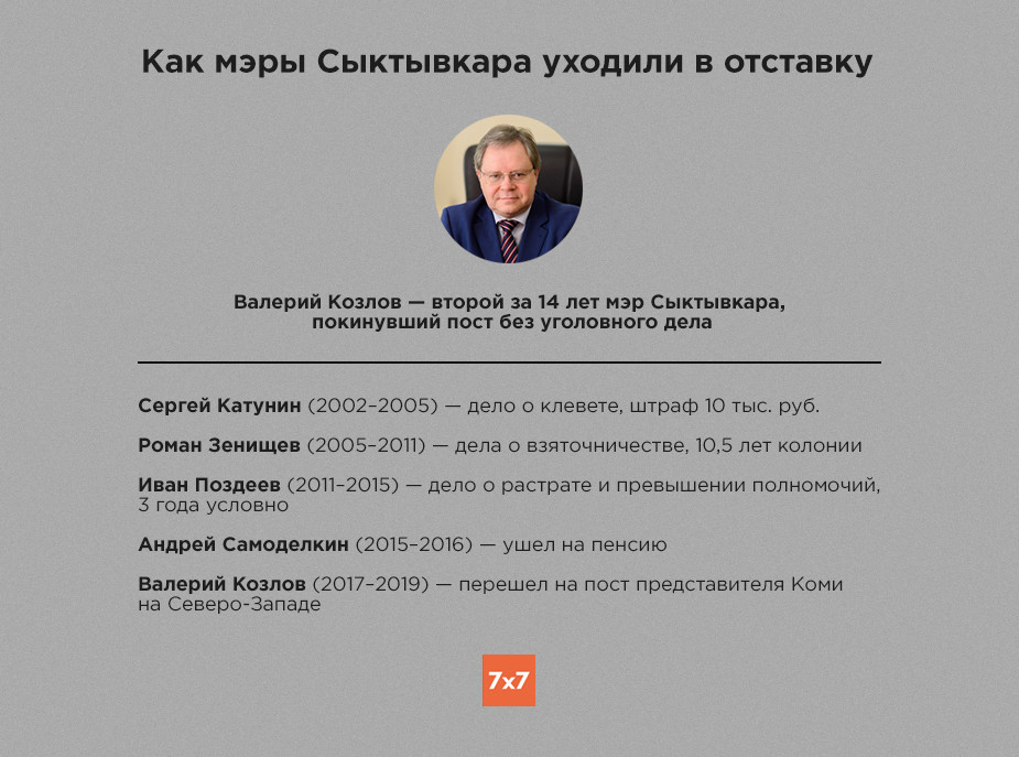 За последние 14 лет Козлов — всего лишь второй руководитель администрации Сыктывкара, который покидает пост без уголовного дела. Его предшественники — Сергей Катунин, Роман Зенищев, Иван Поздеев — были фигурантами уголовных дел о клевете, взяточничестве и превышении полномочий и растрате соответственно. Занимавший пост мэра непосредственно перед Козловым Андрей Самоделкин ушел на пенсию.