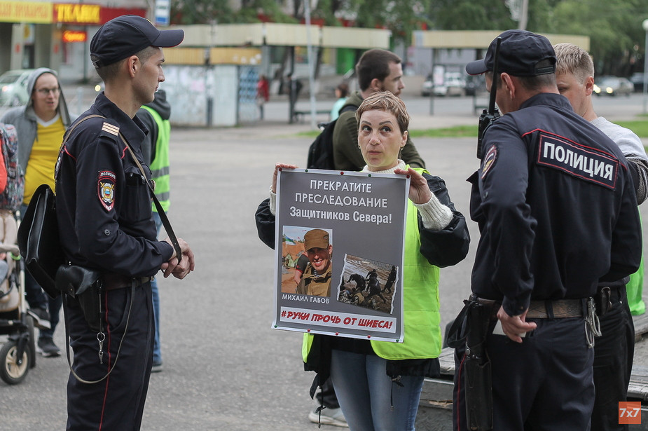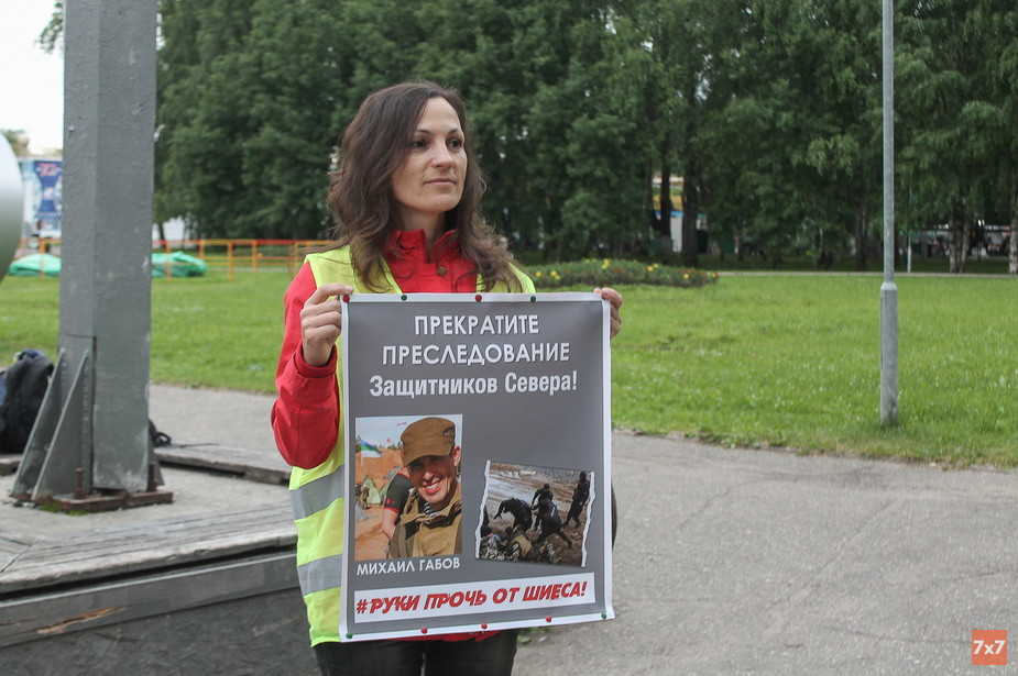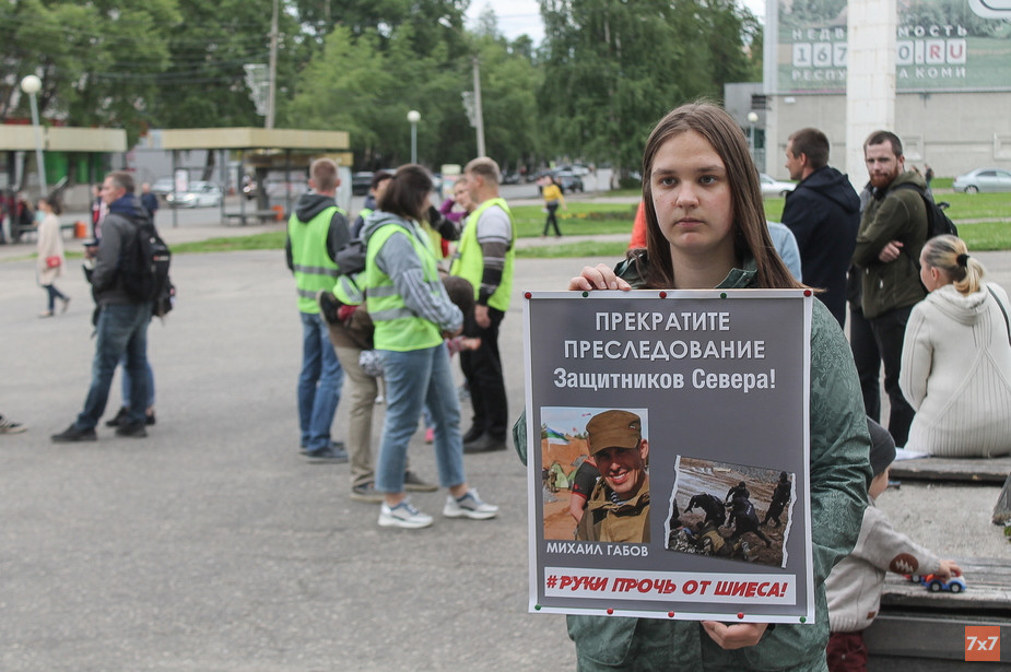 В Сыктывкаре 8 июля на площади около центрального бассейна несколько активистов выстроились в очередь, чтобы постоять в пикете. Они поочередно держали плакат, на котором была фотография обвиненного в нападении на сотрудника охранного предприятия Михаила Габова и требование прекратить преследование защитников Севера. На пикете побывал корреспондент «7x7».
