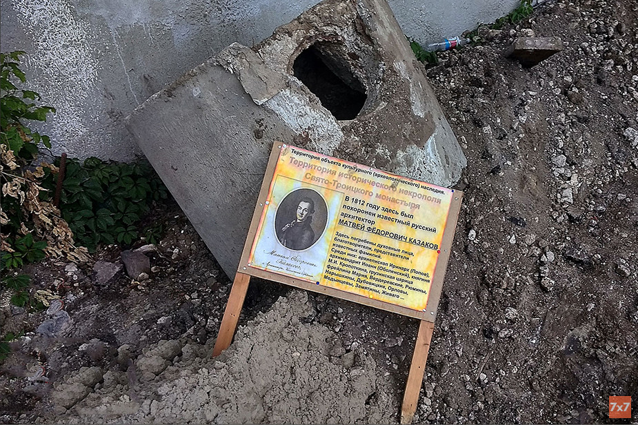 Археолог Василий Конов обнаружил в отвалах земли рядом с траншеей человеческие останки: кости позвоночника, берцовые кости, разбитые лопатами или ломами черепа со свежими сколами. Находки зафиксировали криминалисты Железнодорожного отдела полиции. Спустя две недели археологи установил на месте работ информационный щит с надписью: «Территория объекта исторического (культурного) наследия. Территория исторического некрополя Свято-Троицкого монастыря. В 1812 году здесь был похоронен известный русский архитектор Матвей Федорович Казаков». На щите перечислили известные в регионе и во всей России фамилии духовных лиц и меценатов: Замятины, Нарышкины, Живаго, архимандрит Иоанн (Оболенский).