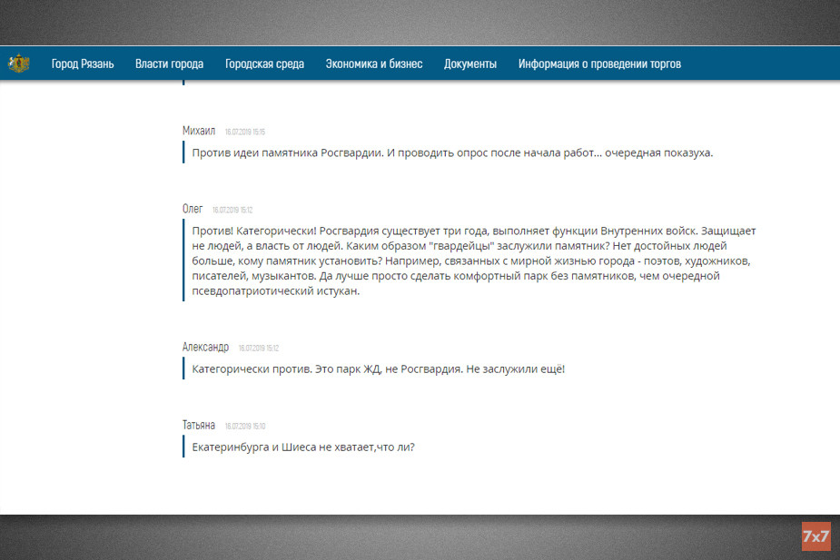 В первые дни опроса «7x7» направил запрос в администрацию Рязани, в котором спрашивал, для чего проводить опрос, если монтажные работы уже начались, и кто именно принимал решение по установке памятника росгвардейцам. Из ответа пресс-службы мэрии следует, что решение об установке памятника было принято в рязанском управлении Росгвардии в 2018 году, члены правительства Рязанской области поддержали принятое решение на совещании. Далее совет культуры Росгвардии выбрал из четырех эскизов один, который был презентован в октябре 2018 года. Устанавливать памятник начали потому, что в апреле 2019 года поступили материалы для его изготовления, а 16 апреля художественный совет решил «провести опрос и выяснить отношение жителей к его установке».