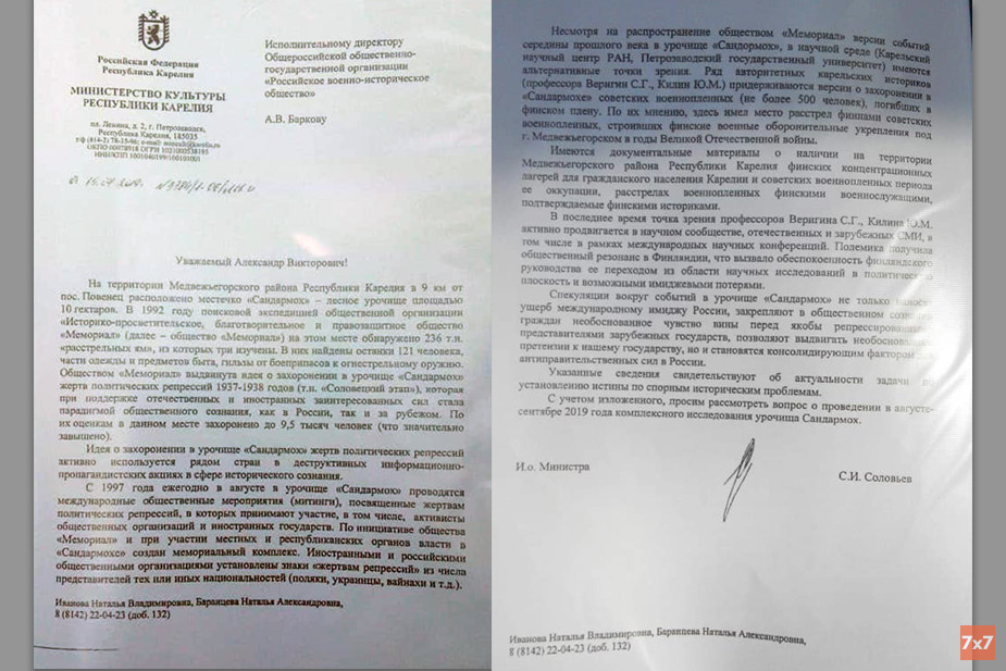 В письме Минкульта говорится, что «идея о захоронении в урочище „Сандармох“ жертв политических репрессий активно используется рядом стран в деструктивных информационно-пропагандистских акциях в сфере исторического сознания».