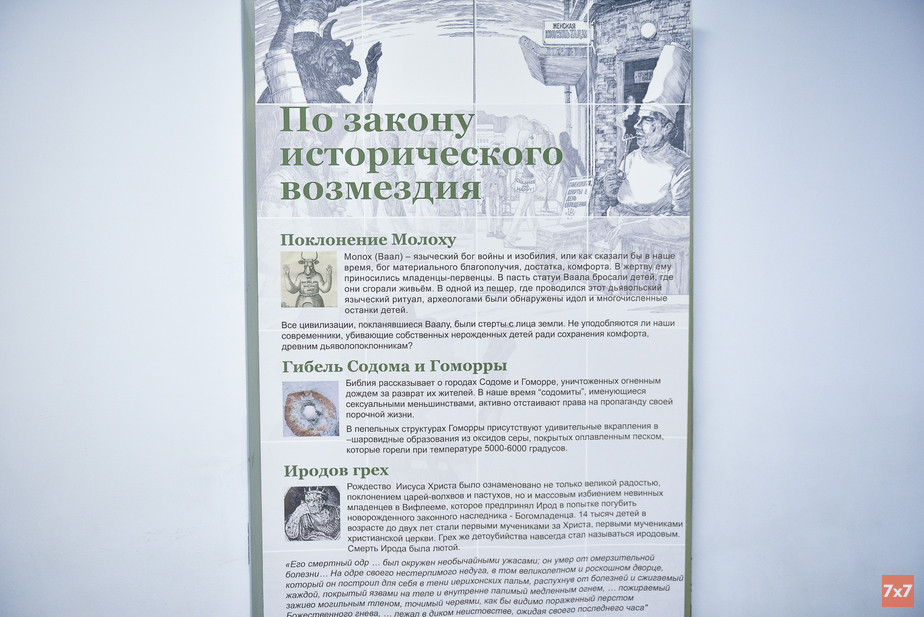 Еще один стенд против «детоубийства» называется «По закону исторического возмездия». В нем люди, приносившие детей в жертву богу войны и изобилия Молоху, сравниваются с «современниками, убивающими собственных нерожденных детей». Далее следует абзац про Содом и Гоморру: «В наше время „содомиты“, именующиеся сексуальными меньшинствами, активно отстаивают права на пропаганду своей порочной жизни».