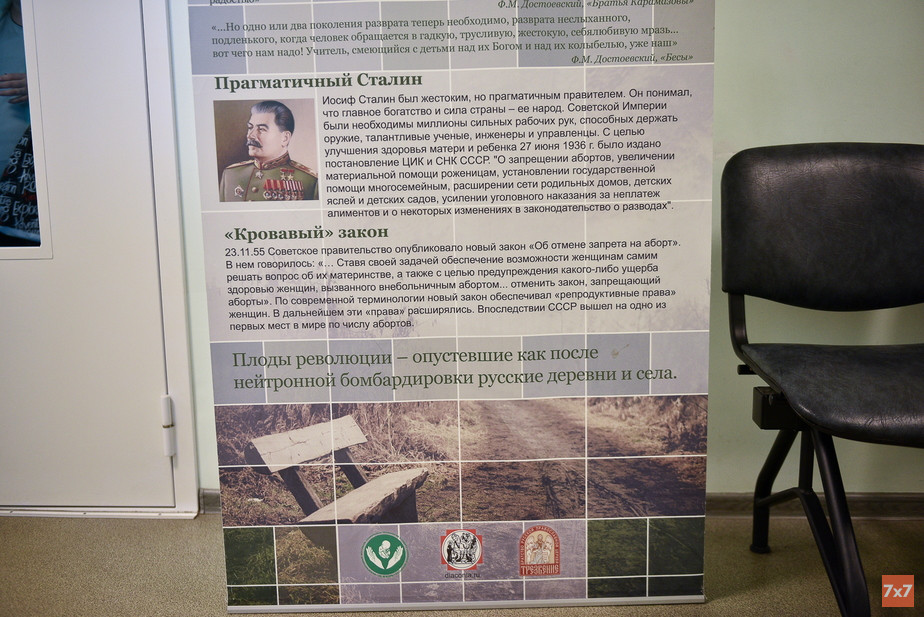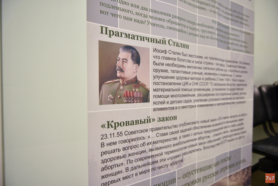 — А зачем нам вот этот вот про Сталина стенд? С какой стати мы должны вот эти вещи вешать? Про вред абортов — да. То, что аборты — это плохо, там есть такая информация. Но Сталин… Этот стенд я не видела.