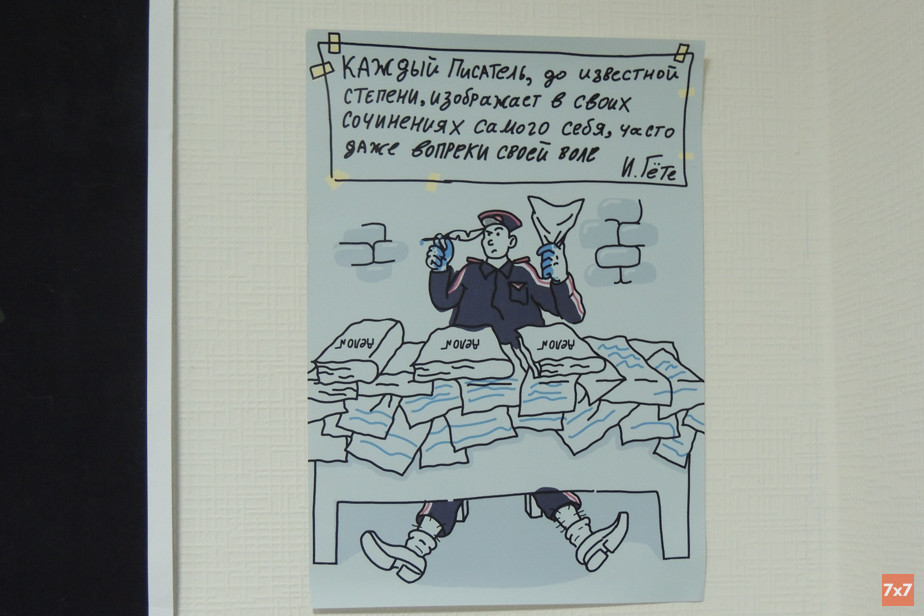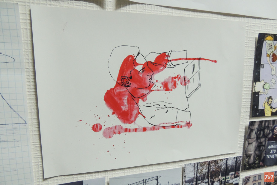 После читки стихов организаторы провели для «7x7» экскурсию по выставке рисунков фигурантов и солидарных художников. Они пояснили, что жанр всех работ — это остросоциальный арт против насилия.