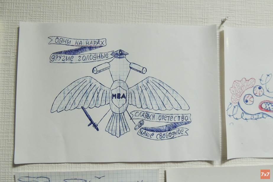 — У многих ребят бумажная волокита по делу занимает весь досуг, — рассказала Вита «7x7». — А у тех, кто пишет и рисует, — своя манера. Виктор Филинков, например, рисует животных и коверкает слова. Это его манера, и это забавно. Юлий Бояршинов начал рисовать енотов, сделали принт с его носиком и лозунгом «Пишите письма политзаключенным», где колючая проволока ограждает всех. Он хорошо распродается.
