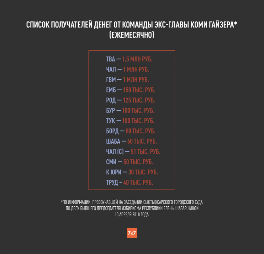 10 апреля в суде допросили бывшего заместителя председателя правительства республики Константина Ромаданова. Он рассказал, что деньги по поручению Алексея Чернова передавались различным людям из окружения экс-главы Коми Вячеслава Гайзера. Ромаданов вел таблицы, где были записаны аббревиатуры или сокращения фамилий и суммы ежемесячных платежей. По словам Ромаданова, этот список не был постоянным — из него исключали тех, кто уезжал из республики или лишался высокопоставленных должностей. Фамилии людей в списке приводились не полностью: иногда это были инициалы, иногда — сокращения. Шабаршина, согласно явке с повинной, была в этом списке под номером «9».