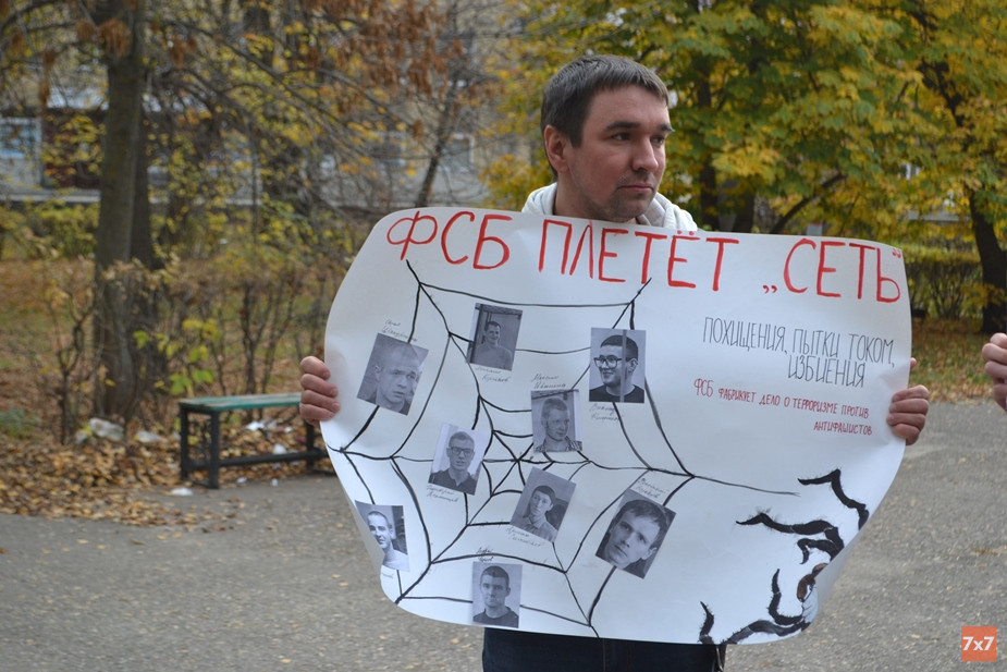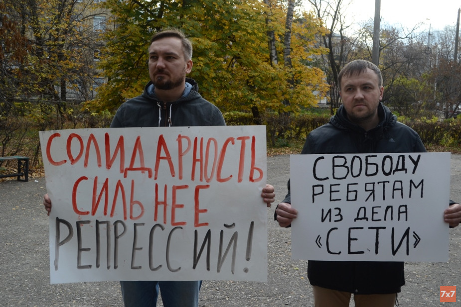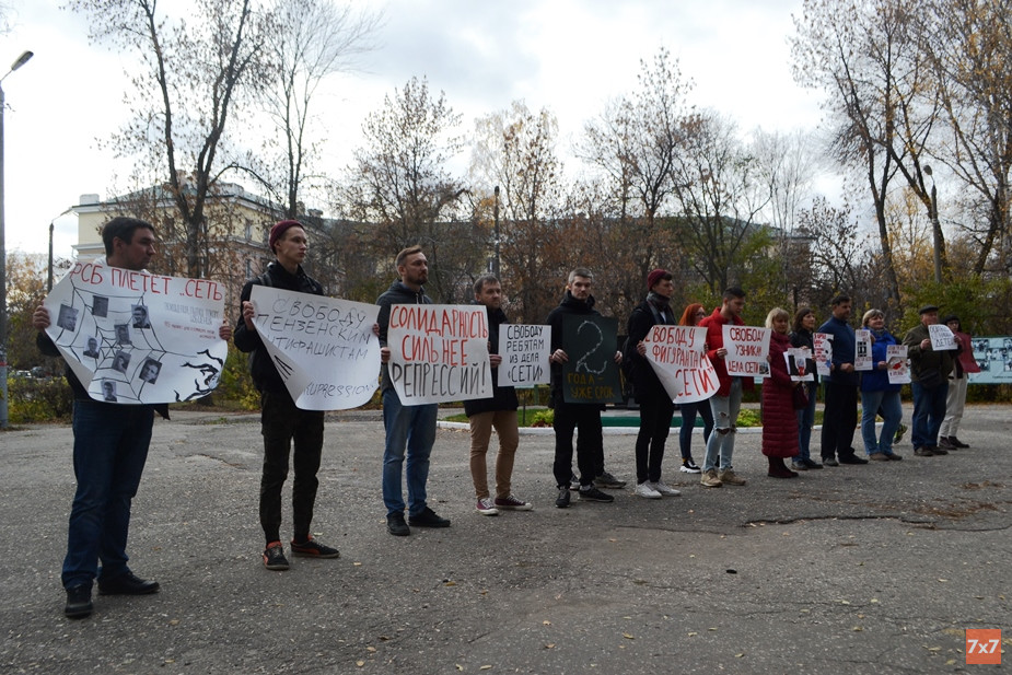 Друзья и активисты развернули плакаты «Свободу фигурантам дела "Сети"*», «Свободу ребятам из дела "Сети"*», «ФСБ плетет "Сеть"*», «Свободу пензенским антифашистам», «Солидарность сильнее репрессий», «Свободу узникам дела "Сети"*» и «Сегодня пришли за ними, завтра придут за тобой».