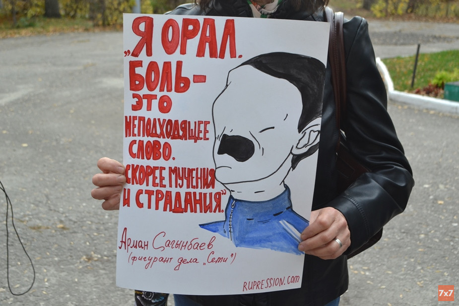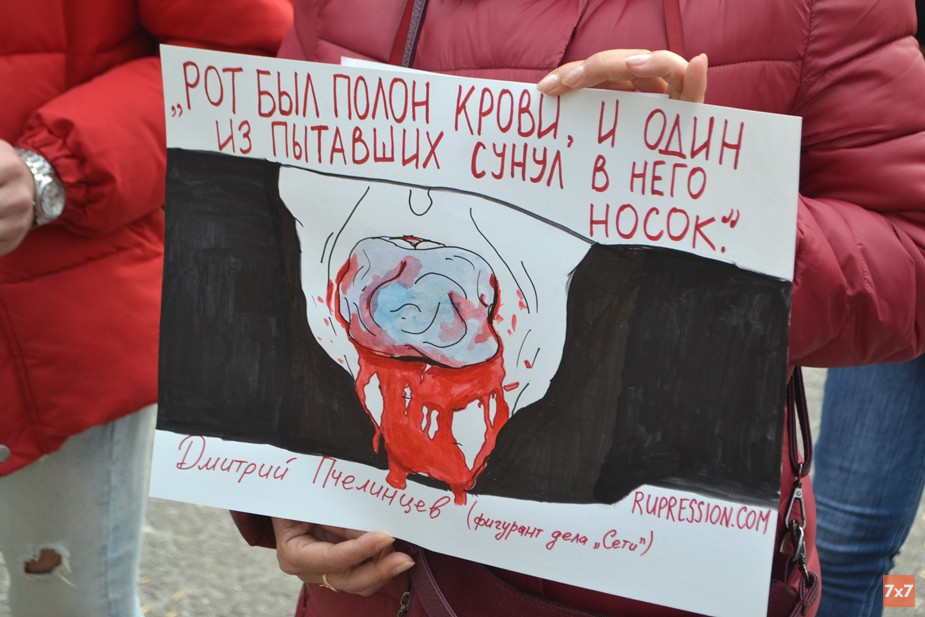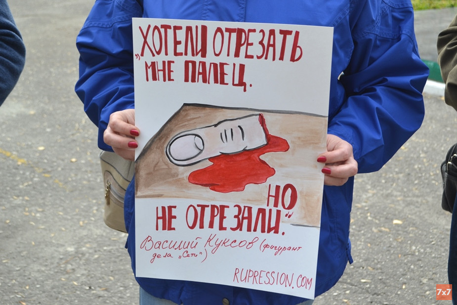 Родственники держали в руках плакаты с цитатами заключенных: «Хотели отрезать мне палец, но не отрезали» (слова Василия Куксова), «Я не вижу неба, не чувствую чистого воздуха» (Илья Шакурский), «Я орал. Боль — это неподходящее слово. Скорее, мучения и страдания» (Арман Сагынбаев), «Рот был полон крови, и один из пытавших сунул в него носок» (Дмитрий Пчелинцев). Брат подсудимого Андрея Чернова Алексей стоял с плакатом «Два года — уже срок».