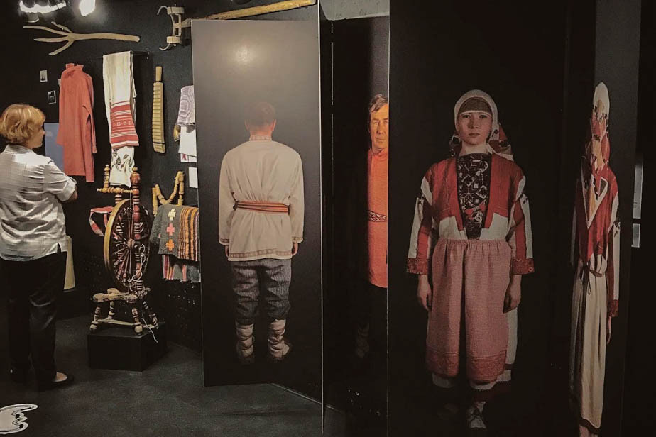 — Это удивительная иммерсивная [с эффектом погружения] экспозиция на основе аудио. Имеет три раздела: Мировоззрение, Семья и Труд. Удмурт переводится как «человек леса»: уд — «человек», мурт — «лес». Посетители могут слышать голоса леса в разные времена года. В залах есть девять наушников, в них звучит 100 фонограмм, в которых звучат песни из архивов и полевые экспедиционные записи. В дуплах шести деревьев показывают видео, рассказывают мистические истории, охотники показывают исчезающий охотничий навык — звукоподражание. Дизайн-концепция снова принадлежит нашим самарским партнерам СамГТУ: экспозиция состоит из двух залов — черного и белого, — символизирующих традиции и современность. В черном зале основная история, а белый будет использоваться для осознания того, что было увидено в черном зале, мастер-классов и даже как зал для камерных концертов.