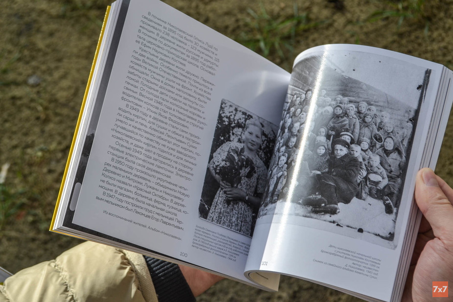 Они очень большие затейники. Купили чистые альбомы и раздали каждой деревне: оформляйте. Все оформили линейно: первая страница — первый дом, вторая — второй. Наклеили фото, вырезки, воспоминания.