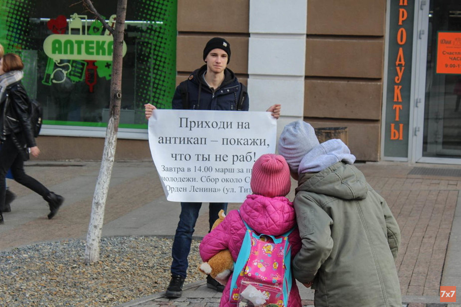Накануне марша комсомольцы вышли на одиночные пикеты в центре города и пригласили горожан на акцию. На одном из плакатов они написали: «Приходи на антикап — покажи, что ты не раб».