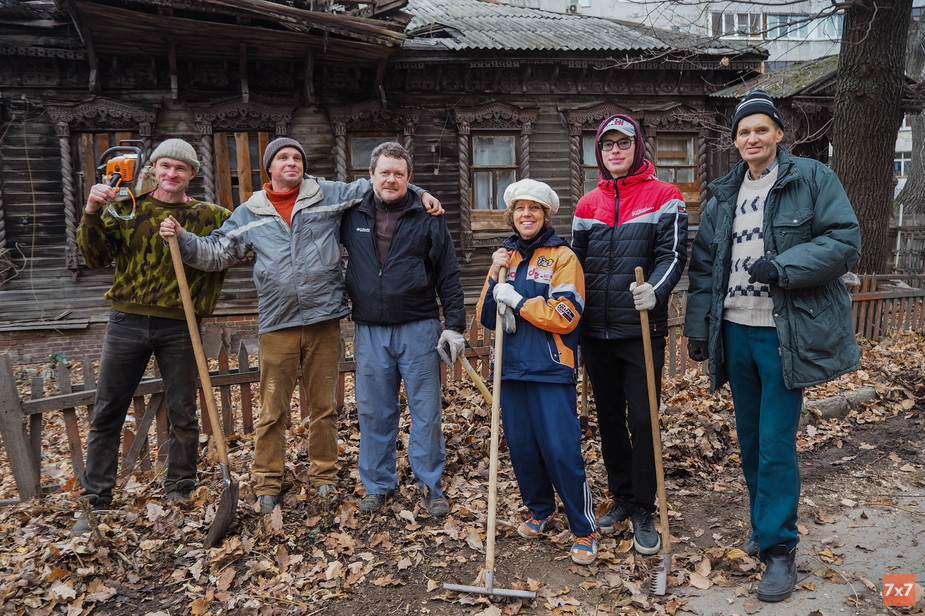 Одни спиливали заросли, другие складывали ветки в кучу, часть добровольцев убирала мусор и листву. Палисадник был завален пустыми бутылками и банками, старой одеждой и обувью. Прохожие интересовались, снесут ли дом, но были и другие вопросы и предложения.