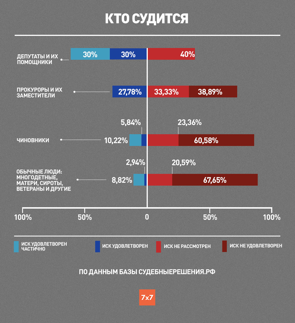 Журналисты «7x7» изучили дела с июня 2013 года по октябрь 2019 года. Все эти дела доступны в базе судебныерешения.рф и на сайтах судов. Анализ показал, что больше всего шансов выиграть дело против губернатора есть у депутатов и их помощников. Наименьшие шансы — у самых обычных людей: пенсионеров, многодетных матерей, военных, учителей, ветеранов, участников митингов и предпринимателей. Почти 90% исков не удовлетворяется или вообще не рассматривается. И только 9% выигрывают дела.