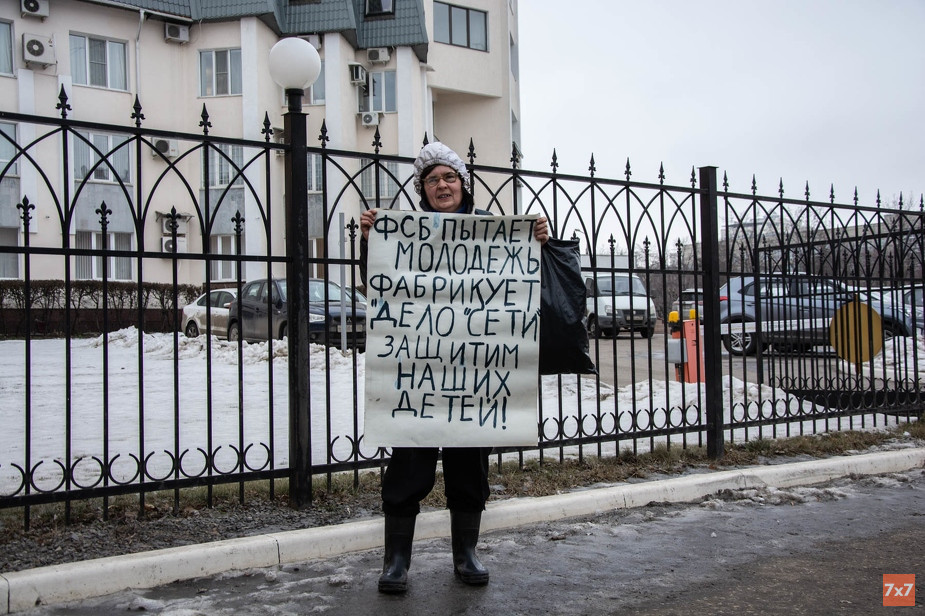 «ФСБ пытает молодежь. Фабрикует дело „Сети“*. Защитим наших детей!» — было написано на плакате Натальи Букатовой. Она во второй раз приехала на пикет из села Федоровка Каменского района Пензенской области. В прошлый раз активисты провели пикеты у здания областного суда 13 сентября.