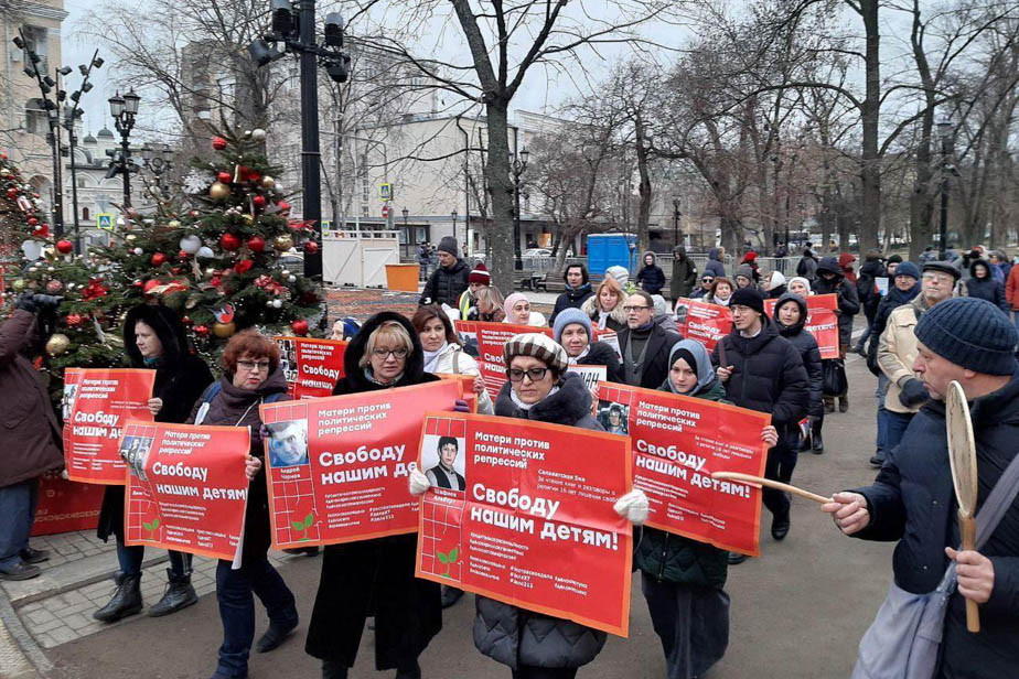 Отдельным строем шли активисты движения «Матери против политических репрессий». Они выразили солидарность повестке марша и выступили с лозунгами за освобождение политзаключенных, против репрессий, пыток и фабрикаций уголовных дел. Среди них были матери подсудимых дела «Сети»* Светлана Пчелинцева и Татьяна Чернова. Татьяна Чернова сказала «7х7», что движение матерей было очень заметно в толпе – белые платки в черный горошек и красные плакаты стали узнаваемы. По словам Светланы Пчелинцевой, акция прошла хорошо и позитивно, многие обещали приехать в Пензу на приговор по делу «Сети»*.
