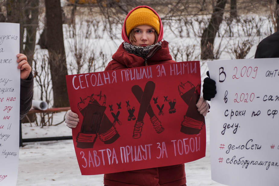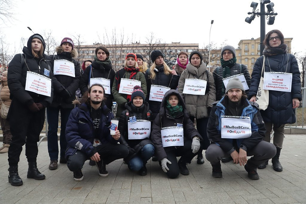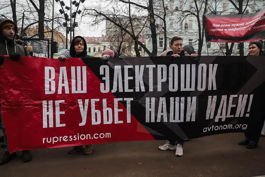 На одном из плакатов была надпись: «Дело „Сети“* – это какая-то пытка», на других - «Ваш электрошок не убьет наши идеи» и «Антифашизм – не преступление». Другие плакаты были в поддержку фигурантов «московского» и других политических дел.