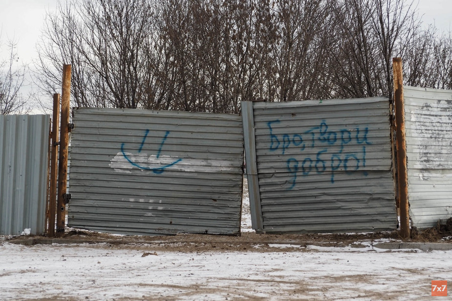 Корреспондент «7x7» побывал в парке Морской славы и убедился, что котлован засыпан, но только частично. Яма уменьшилась примерно наполовину, искореженный забор остался на своем месте. На нем появилось много надписей, к примеру: «Бро, твори добро!».