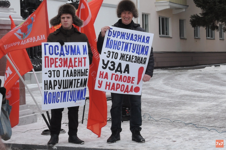 Митинг состоялся на площадке у кинотеатра «Россия». Участники протестовали против поправок к Конституции РФ, предложенных Владимиром Путиным. Они держали в руках плакаты с лозунгами «Госдума и президент — главные нарушители Конституции!», «Буржуазная Конституция — это железная узда на голове у народа», «Судей на суд народа!», «Олигархам миллиарды! Народу — электронно-цифровой концлагерь!».
