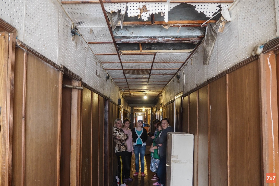 «Экскурсия» в душевую комнату оказалась опасной: во всем коридоре давно прогнил пол, ступать пришлось по шатким дощечкам. Первым делом женщины показали огромную дыру в полу душевой: через нее крысы приходят пить воду, когда их травят всем бараком. Помимо них тут живут клопы и тараканы, летают мошки — травить эту «живность» бесполезно.