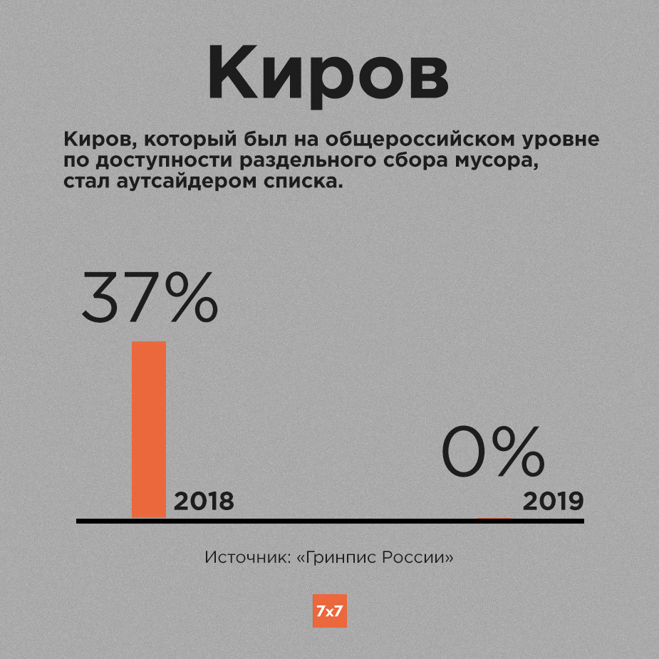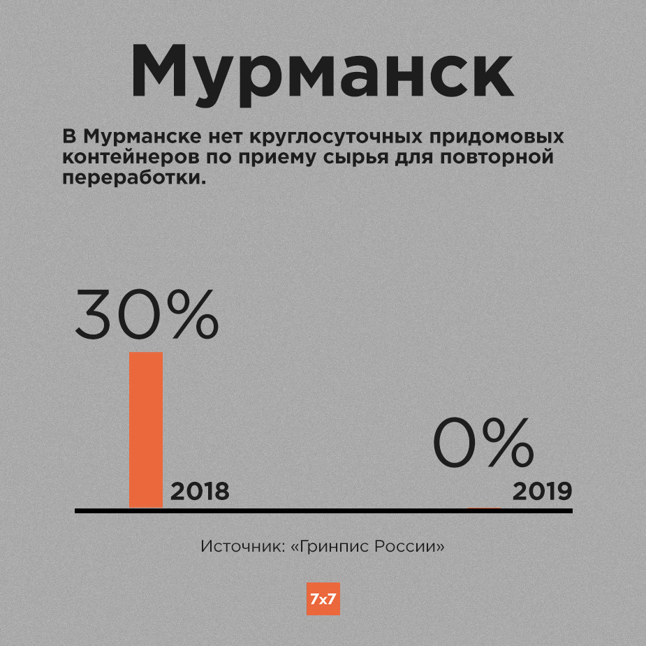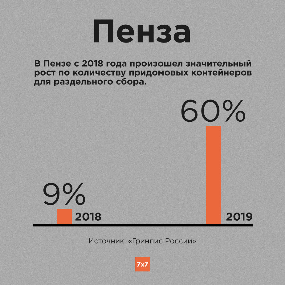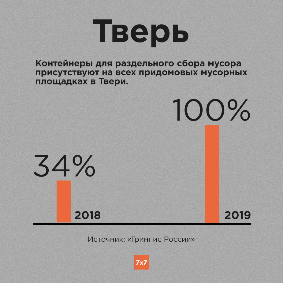 Экологическая организация Гринпис России выпустила ежегодный доклад, где проанализировала возможность приема рассортированного мусора в 165 городах страны с населением более 100 тыс. человек. Экологи учитывали стационарные контейнеры, предполагающие отдельный сбор хотя бы одного вида вторсырья. По сравнению за год (с 2018 по 2019) количество таких контейнеров в России выросло в два раза — но есть и регионы, где за год контейнеры исчезли совсем.