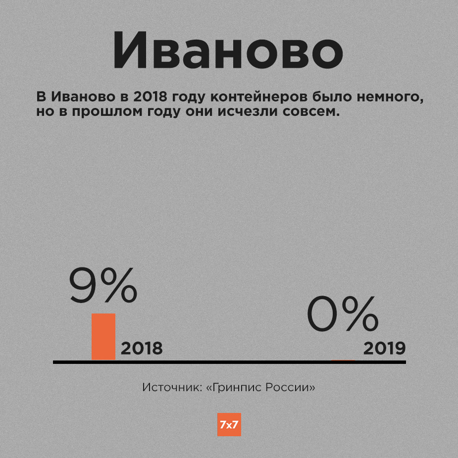 Полностью исчезли контейнеры для раздельного сбора мусора в Кирове, Мурманске и Иваново — годом ранее тут было 37%, 30% и 9% мусорных площадок соответственно.