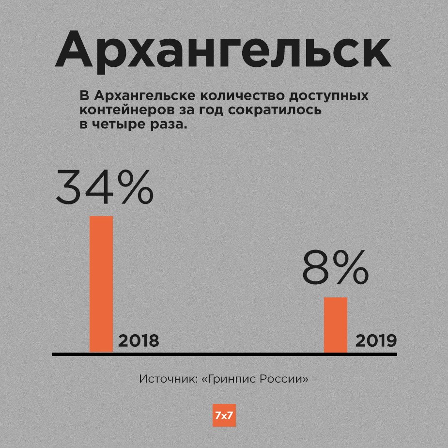 Есть и города, где количество контейнеров резко уменьшилось по сравнению с 2018 годом. Например, в Архангельске теперь только 8% жителей имеют доступ, тогда как годом ранее таких людей было 34%.
