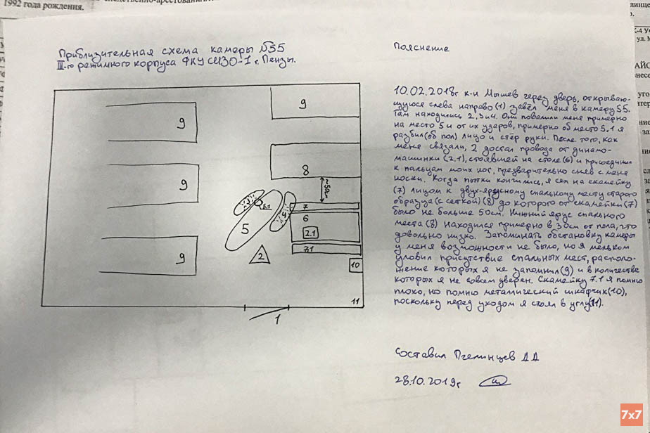 2 декабря 2019 года — пензенский омбудсмен подтвердила рассказы о пытках фигурантов дела «Сети»*. Суд приобщил к материалам схемы пыточных камер. Их зарисовали Дмитрий Пчелинцев и Илья Шакурский.