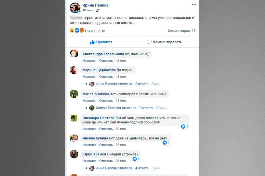 — Брат не успел снять, как член комиссии забрала этот список, оно и понятно: люди шли просто проголосовать, а не отстаивать свои права со включенной камерой. Обидно за маму, потому что она шла голосовать за поправки, а после случившегося сильно разнервничалась. Она так и не стала голосовать, — рассказала Панина корреспонденту «7x7».