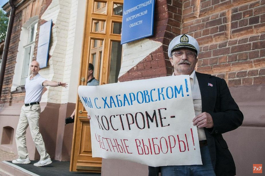 Активисты общественной организации «Народовластие» собрались на Октябрьской площади накануне, 24 июля. Они покормили голубей, после чего отправились в областную администрацию на встречу с губернатором Сергеем Ситниковым. Они собирались потребовать от главы региона не чинить препятствий для прохождения муниципального фильтра кандидату в губернаторы от партии «Яблоко» Александру Лазутину, чье выдвижение поддержали экологическое движение «Во имя жизни» и «Народовластие» (губернаторские выборы пройдут в Костромской области в сентябре этого года). Еще одной темой акции была поддержка жителей Хабаровска, что отражал плакат «Мы с Хабаровском!». Попасть к губернатору жителям не удалось, пройти в здание им не дала охрана на входе.