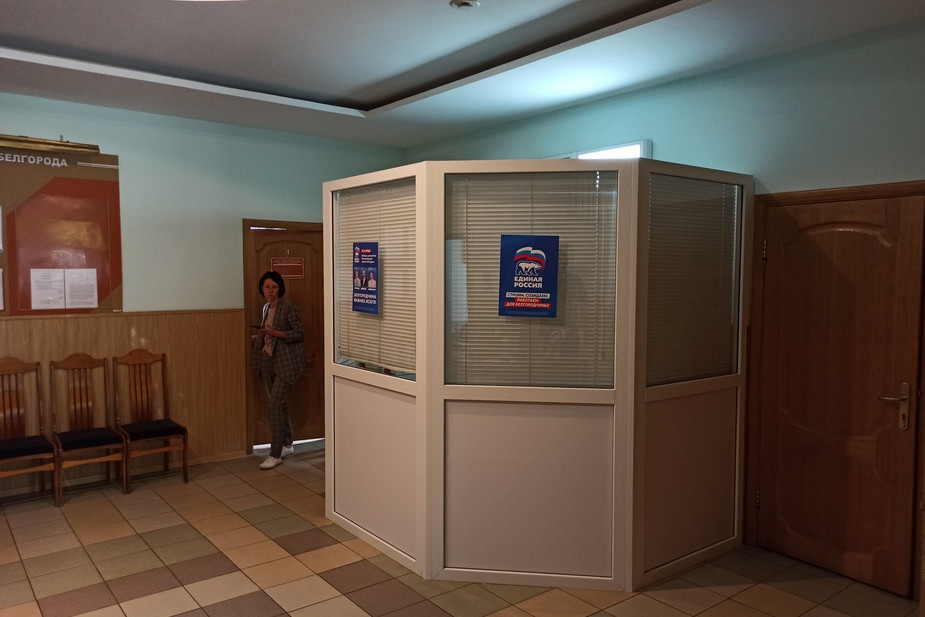 А на одном из участков в Белгороде комплекс вовсе не мобильный. Но кабинки для тайного голосования находятся на втором этаже. А бюллетени выдают на первом. Просто так получилось.