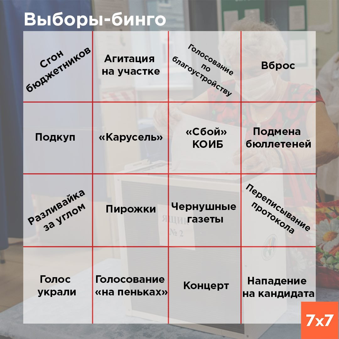 11:16 Перед началом голосования мы на «7x7» подготовили выборы-бинго - шуточную табличку с самыми распространенными информационными поводами любого дня выборов в России. В ней можно зачеркнуть еще одну клеточку. Рязанские наблюдатели и избиратели третий день фиксируют подкуп избирателей в избирательном округе №16 — за 400 руб. они голосуют за единоросса Александра Ачалова. Происходит это так: молодые люди в красных кепках выдают купоны с надписью «Сторонник Ачалова», вписывая в него данные избирателя, который голосует за единоросса, затем сдает купон обратно. За три дня были зафиксированы случаи, когда избиратели не могли найти «кассира» и спрашивали у членов УИК №№ 936 и №937, где можно получить деньги.