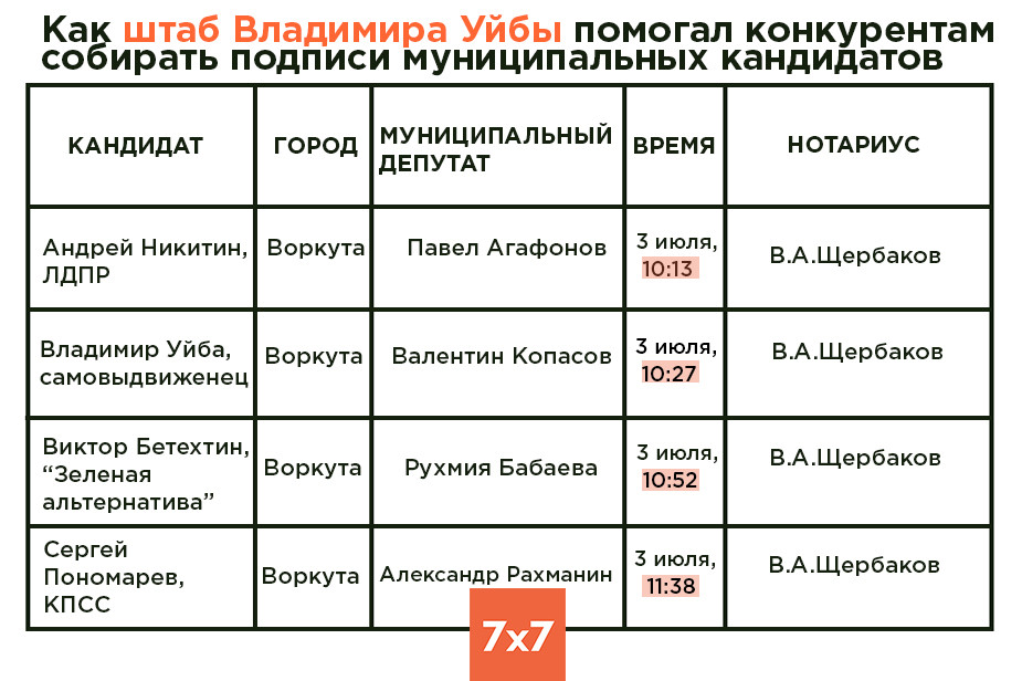 Коммунисты обнаружили, что муниципальные депутаты расписывались за соперников коммуниста с разницей в несколько минут, а их голоса заверял один и тот же нотариус. В партии уверены, что сбором подписей для Уйбы, Никитина, Бетехтина и Пономарёва занимался один штаб. В пресс-службе главы Коми не ответили на вопрос «7х7» об этом.