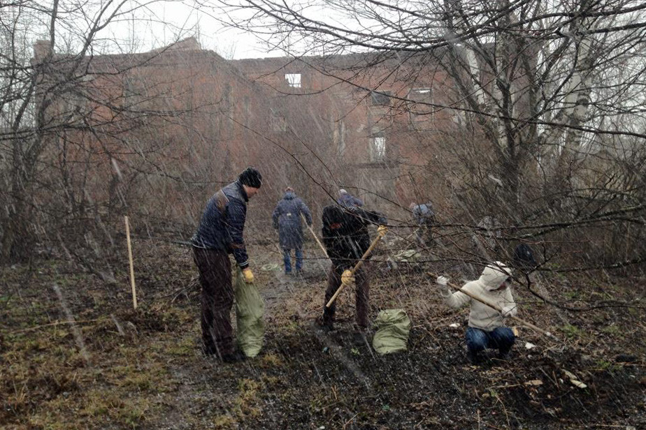 Первый выезд группы "Альтуризма" в апреле 2015 года. Группа туристов из Москвы помогает очистить от мусора площадку у здания поликлиники. Фото из группы vk.com/altourism