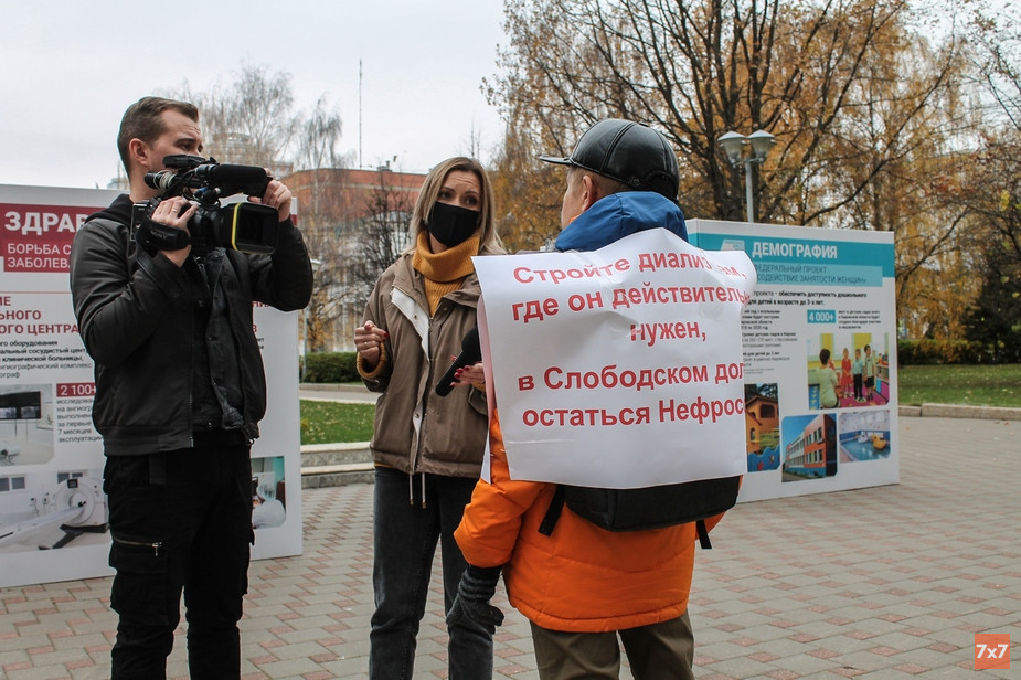 Первым в пикет к зданию правительства вышел руководитель кировского отделения «Нефро-Лиги» Павел Шишкин. Он прикрепил к своей одежде два плаката: «Пациенты имеют право на выбор медицинской организации» и «Стройте диализ там, где он действительно нужен, в Слободском должен остаться „Нефросовет“». Неподалеку в ожидании своей очереди стояли еще семь человек, почти все они — пациенты частного отделения гемодиализа в Слободском. Некоторые из них приехали в Киров сразу после процедуры, для которой им приходится вставать в 4:00, а то и в 3:00.